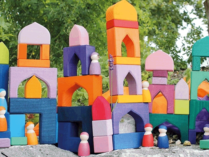 Großer Baukasten mit 54 Holzbausteinen im orientalischen Stil. Mit den bunten Holzklötzen, die 4 cm dick und zwischen 2 und 12 cm lang sind, lassen sich tolle Konstruktionen bauen. Aus Lindenholz, farblich lasiert.