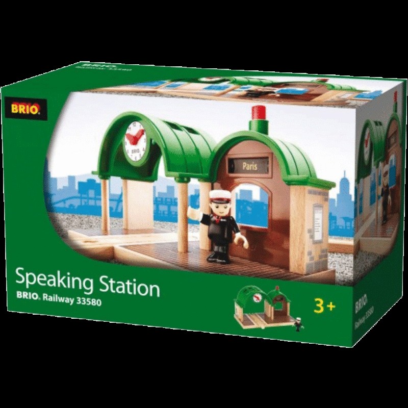 Ein sprechender Bahnhof! Mit eingebautem Fahrkartenschalter und Spielfigur. Auf Knopfdruck werden die Fahrgäste je nach Bahnhofsschild auf Englisch, Deutsch oder Französisch willkommen geheißen! 2 x LR 44 1,5-V-Batterien sind nicht enthalten. Länge des Bahnhofs 218 mm. Eingebaute Schiene 108 mm.
